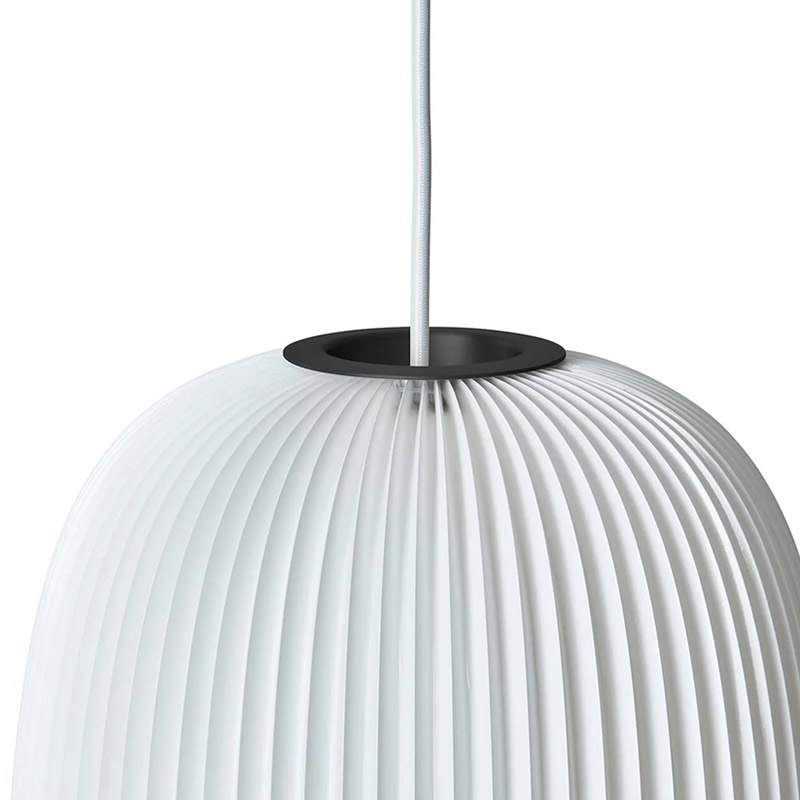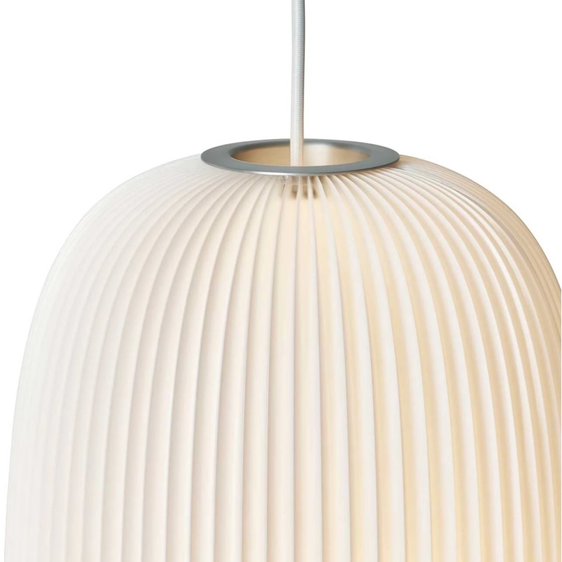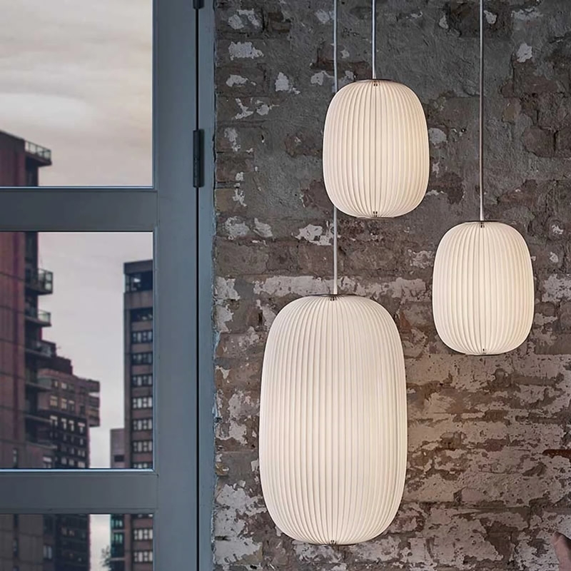 This pendant light features unique layered lamella structure. Moreover, precisely calculated lamella angles ensure even light distribution. Meanwhile, white PE material provides excellent light filtration. The aluminum frame guarantees structural stability.