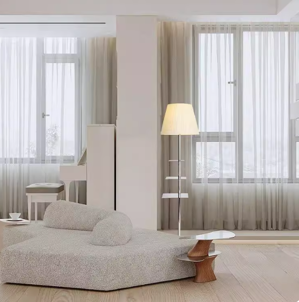 This Nordic-inspired floor lamp integrates a storage rack with a vertical design. It uses iron, stainless steel, and a fabric shade for a balanced look.