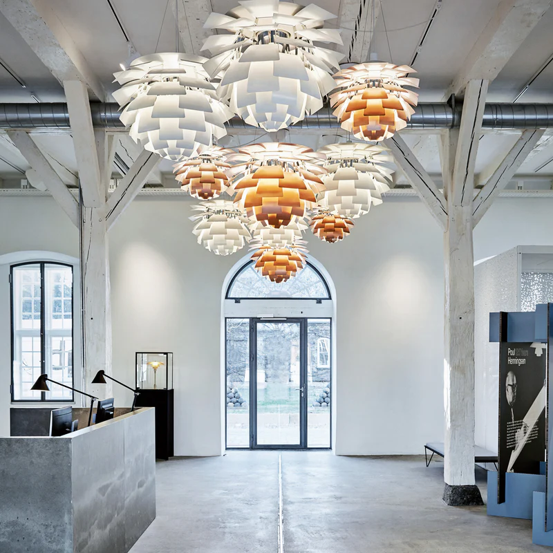 The PH Artichoke is a legendary masterpiece by designer Poul Henningsen. Its unique structure of 72 leaves creates a fully sculptural light source. We craft it with premium satin etched glass and precision-plated stainless steel for superior quality.